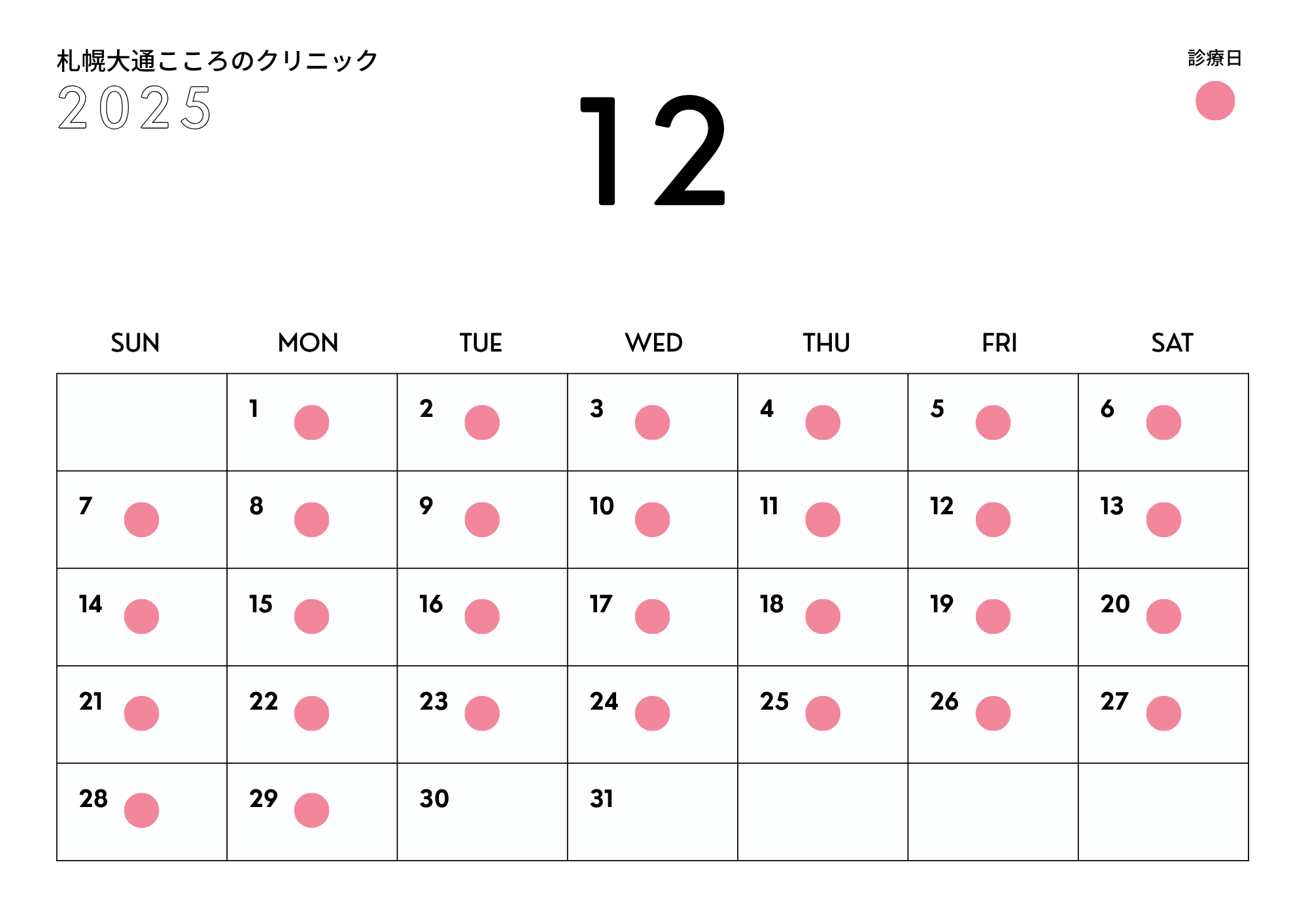 平素より当院をご愛顧いただき、誠にありがとうございます。 2025年12月の診療日について、ご案内申し上げます。 ■診療時間 10:00~14:00、15:30~20:00 ■休診日 12月30日(火)、12月31日(水) ■診療日 上記休診日を除く、月曜日から日曜日まで、休まず通常通り診療いたします。 休診日をご確認の上、お間違えのないようご来院ください。 どうぞよろしくお願いいたします。 24時間受付中 WEB予約