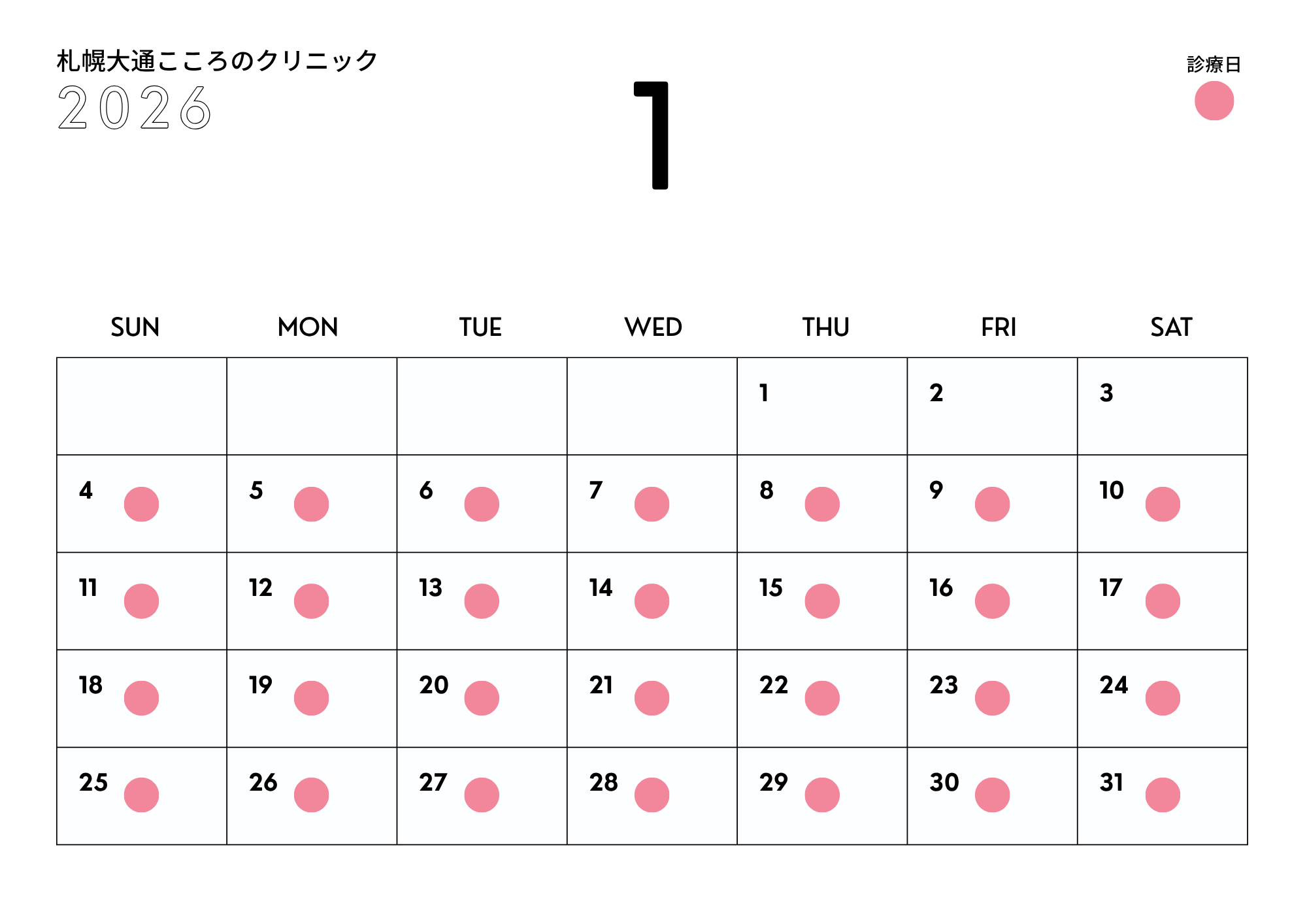 平素より当院をご愛顧いただき、誠にありがとうございます。 2026年1月の診療日について、ご案内申し上げます。 ←2025年12月の診療日はこちら ■診療時間 10:00~14:00、15:30~20:00 ■休診日 1月1日(木)、1月2日(金)、1月3日(土) ■診療日 上記休診日を除く、月曜日から日曜日まで、休まず通常通り診療いたします。 休診日をご確認の上、お間違えのないようご来院ください。 どうぞよろしくお願いいたします。 24時間受付中 WEB予約
